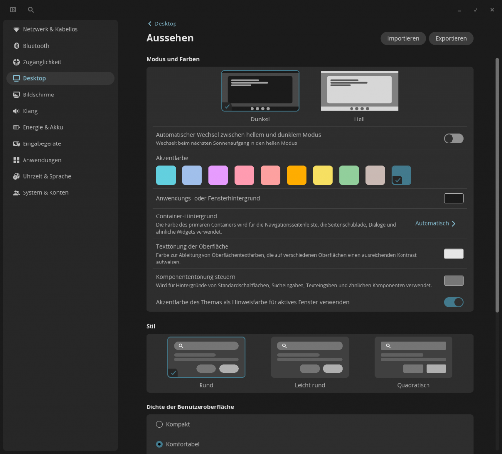 Beim „Stil“ kann ich zwischen mehr oder weniger gerundeten Ecken wechseln. Das zeigt sich an den Fensterecken und vor allem am unteren Dock. Wie dicht gedrängt die Inhalte im Fenster angeordnet sind, beeinflusst „Dichte der Benutzeroberfläche“. Standardeinstellung ist „Komfortabel“, mit „Kompakt“ ist alles etwas dichter gedrängt, mit „Geräumig“ werden die Abstände deutlich größer. Weiter unten lässt sich noch die Schriftart und -größe anpassen.