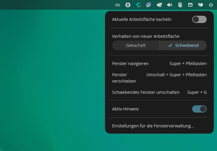 Über das Panel schaltet man in Cosmic schnell zwischen Kachel- und Schwebemodus um.