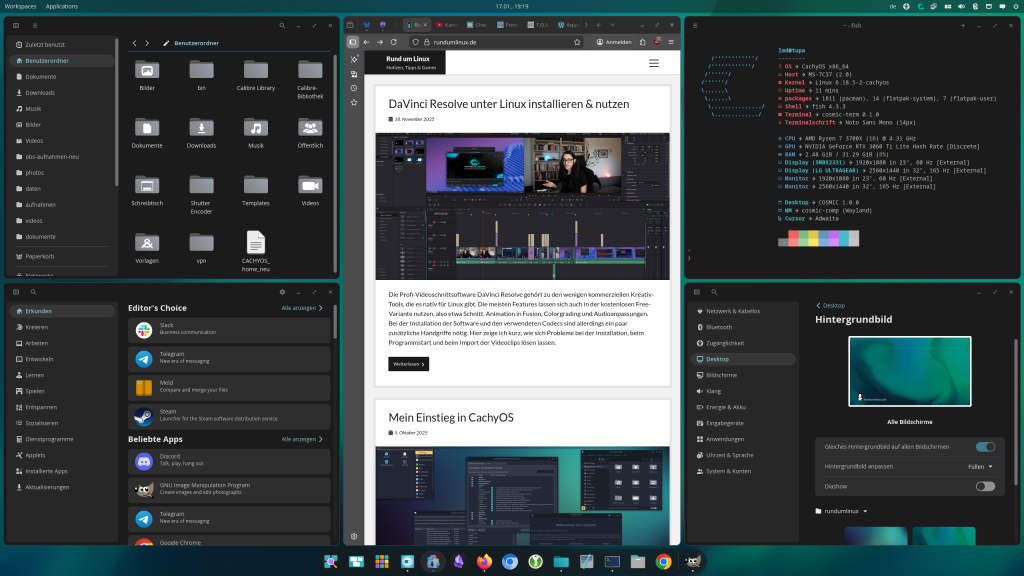 Seit Ende letzten Jahres gibt es den Rust-basierten Cosmic-Desktop von System76 in einer ersten stabilen Version. Den habe ich bei mir unter CachyOS installiert und ausprobiert. Hier stelle ich die wichtigsten Funktionen und Cosmic-Anwendungen vor.