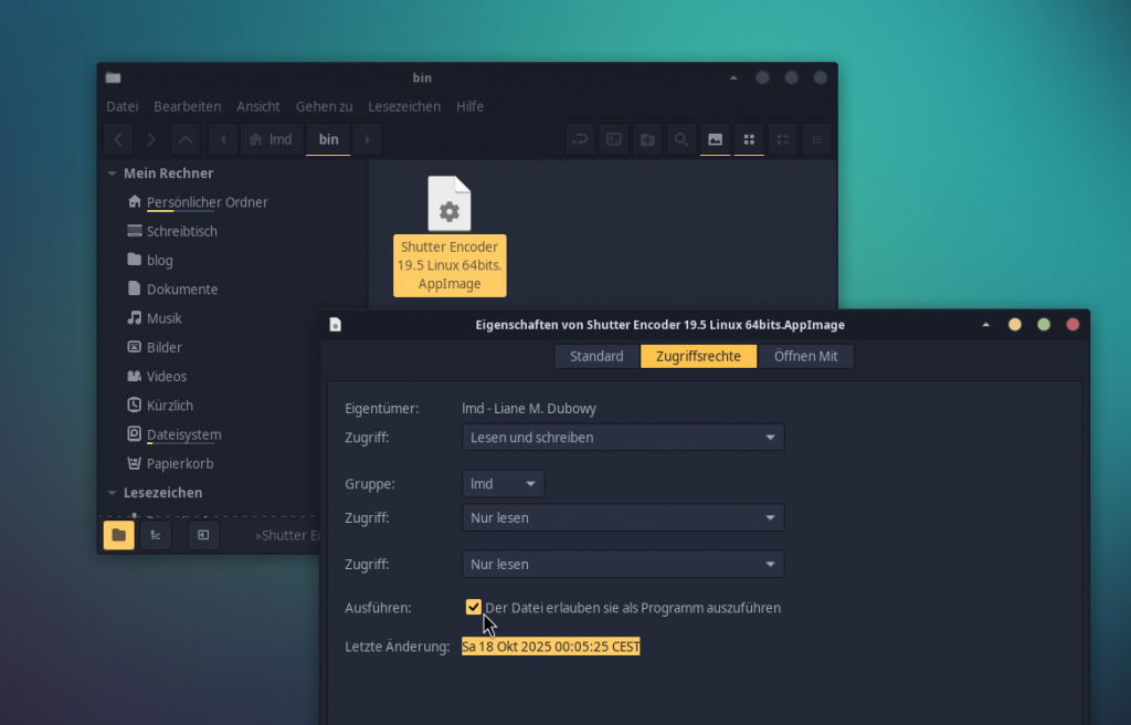 Shutter Encoder gibt es auf der Projekt-Website als AppImage herunter, das nicht installiert werden muss. Um es ausführbar zu machen, reicht ein Rechtsklick, dann „Eigenschaften“, in den Reiter „Zugriffsrechte“ wechseln und das Häkchen bei „Der Datei erlauben sie als Programm auszuführen“ setzen. So läuft das beispielsweise in meinem Dateimanager Nemo, bei anderen ist das ähnlich.