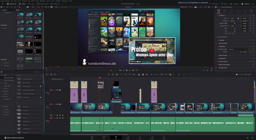 Sind die Einstiegshürden übersprungen und der Workflow für den Videoschnitt mit den richtigen Codecs ist gefunden, dann ist DaVinci Resolve eine spektakuläre Videoschnittsoftware für Linux. Zwar lassen sich einfache Projekte auch mit Kdenlive umsetzen, bei umfangreicheren Videos spart man mit DaVinci aber viel Zeit und kann auf viele Features zurückgreifen.