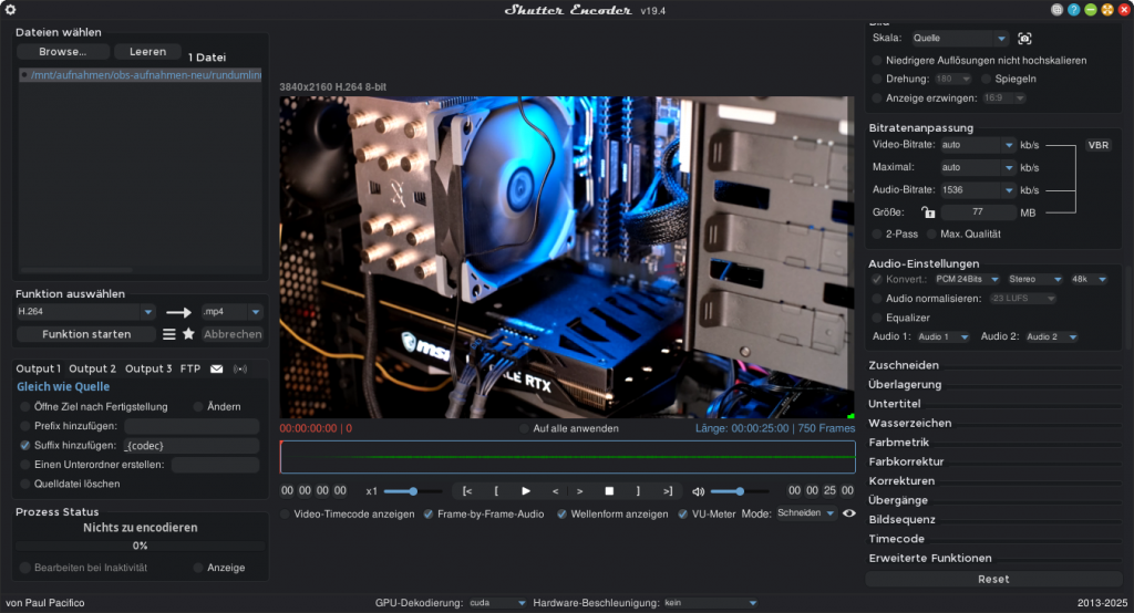 Bleiben die anderen Formate. Nicht passende Videoaufnahmen aus Kameras und Framegrabbern konvertiere ich vor dem Videoschnitt. Das erledigt entweder ein ffmpeg-Kommandozeilenbefehl oder ein kleines Skript. Wer das nicht selbst schreiben will, kann das Skript aus dem Nobara-Wiki anpassen. Noch einfacher geht es allerdings mit dem grafischen Tool Shutter Encoder, das einzelne Clips oder auch einen ganzen Schwung auf einmal konvertieren kann.
